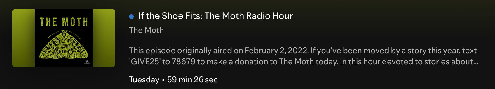 In this hour devoted to stories about footwear, walk a mile in another person's shoes. Every journey begins with a single step, and hopefully, some comfortable kicks. This episode is hosted by Moth Senior Director Jenifer Hixson. The Moth Radio Hour is produced by The Moth and Jay Allison of Atlantic Public Media.