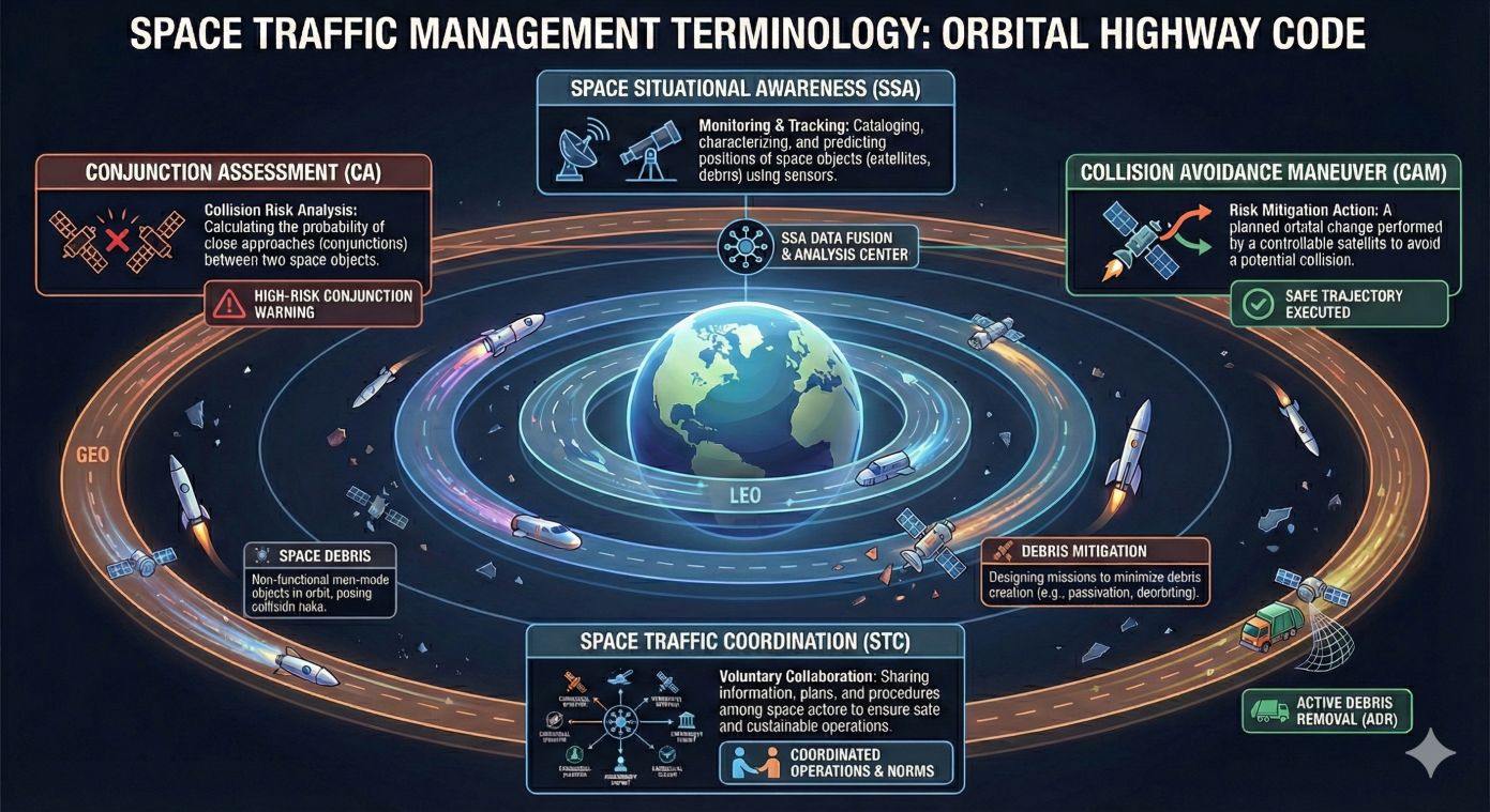 Standardization of Space Traffic Management Terminology - The rapid expansion of the global space economy has introduced a complex array of challenges regarding how objects move, interact, and operate above the Earth. Thousands of satellites now populate Low Earth orbit, joined by rocket bodies, mission-related debris, and fragments from past collisions.