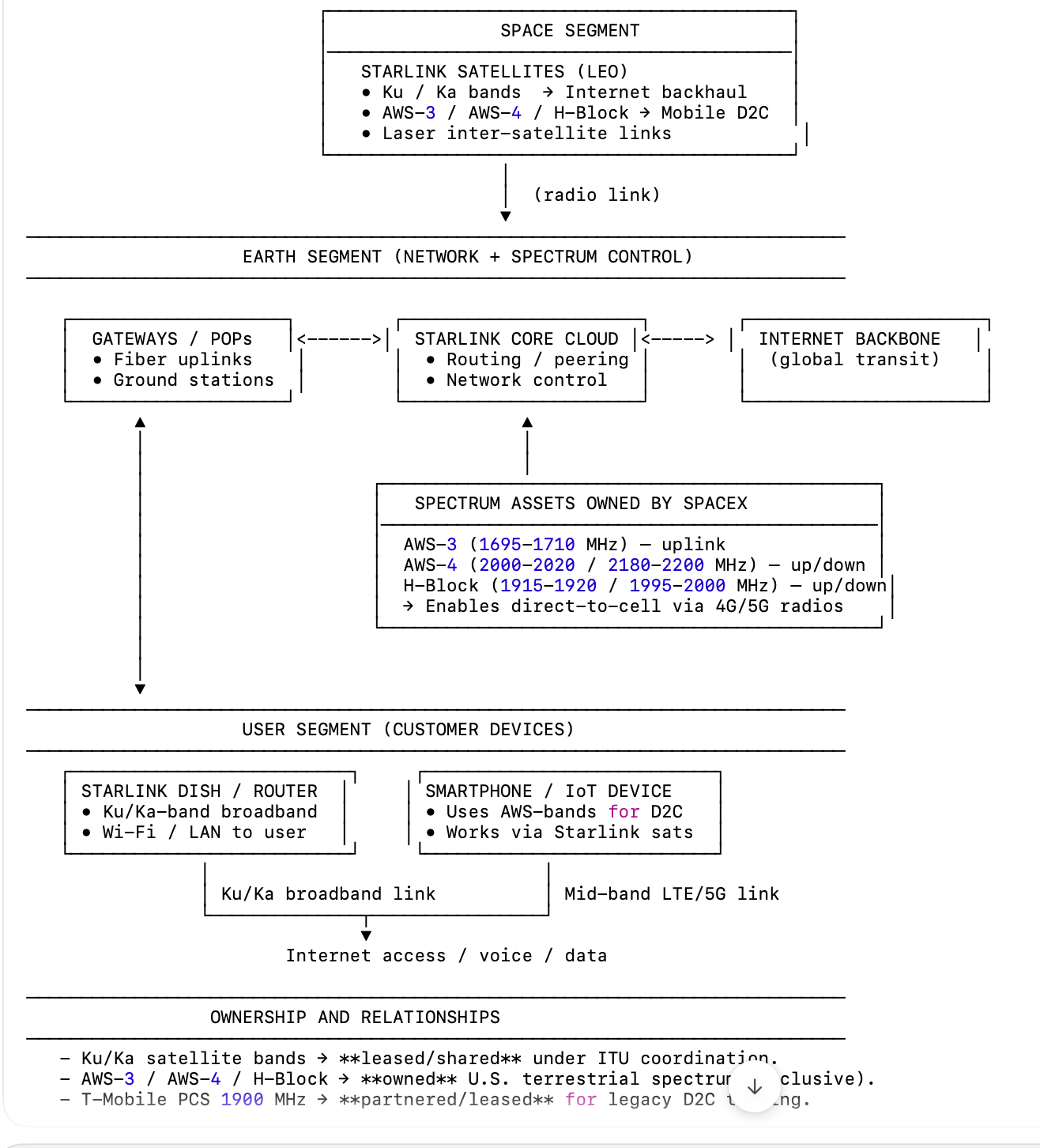 My Take: More spectrum to unravel. Does this help? I think I broke ChatGPT. In short, SpaceX now holds enough U.S. spectrum to operate like a hybrid satellite–mobile carrier, not just an ISP from orbit.